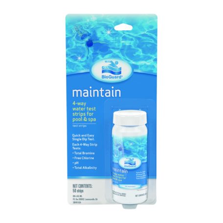 4-wat test strips from BioGuard, the makers of Spaguard hot tub care products. Test for pH, alkalinity, bromine, and pH